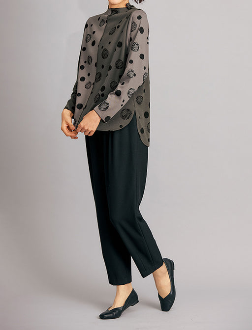 クラシカルなドットプリントが魅力の上品なブラウス。 シンプルながらも華やかさがあり、デイリーからオフィスカジュアルまで幅広く活躍します。 軽やかな生地感と程よいゆとりのあるシルエットで、快適な着心地。