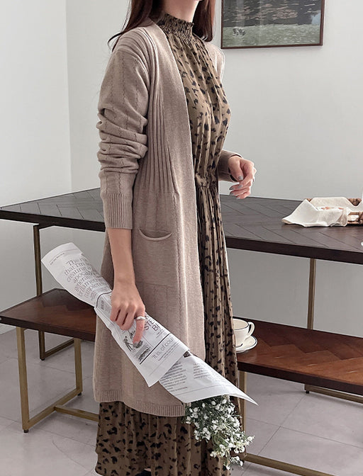柔らかな質感が特徴のブークレーニットカーディガン。<br>ロング丈とノーカラーのデザインが、シンプルでありながらも洗練された印象を与えます。<br>すっきりとしたラインで、リラックス感のあるシルエットを作り出します。