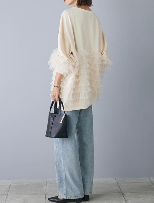 軽やかなオーガンジーを重ねた、涼しげで華やかなカットソー。<br>フレンチスリーブが腕まわりを優しくカバーし、女性らしいシルエットに。<br>ほどよい透け感と立体感で、シンプルながら印象的な一枚です。