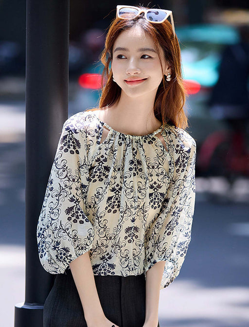 フェミニンな柄が目を惹く、大人かわいいシャツブラウス。 バールをあしらった襟元がエレガントに演出してくれます。 シワになりにくく、リゾートや夏のお出かけにもぴったり。