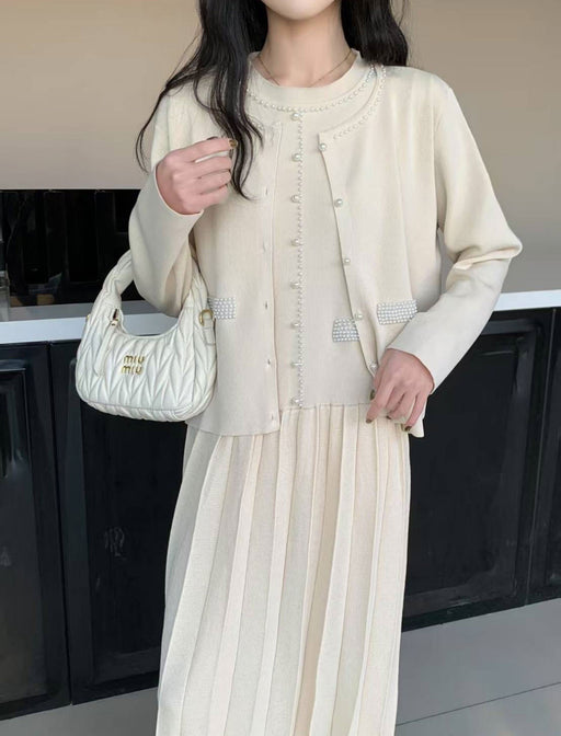 パール使いが上品に映える、ツイード調カーディガンとワンピースのセットアップ。 カーディガンは程よいフィット感で体型を美しく見せ、ワンピースのプリーツが歩くたびにエレガントな印象に。 大人の女性にふさわしい、洗練された上品さが魅力のセットアップです。
