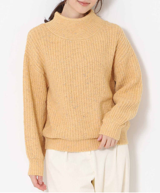 抜け感とモードな輝き、最旬モックネックで魅せるスタイル。 ラメ糸をコイル状に巻きつけた独特のネップ感が特徴で、表面に陰影と奥行きを与えています。 首元はややゆとりのあるフレンチモックネックで、抜け感があり、カジュアルながらも洗練されたデザイン。