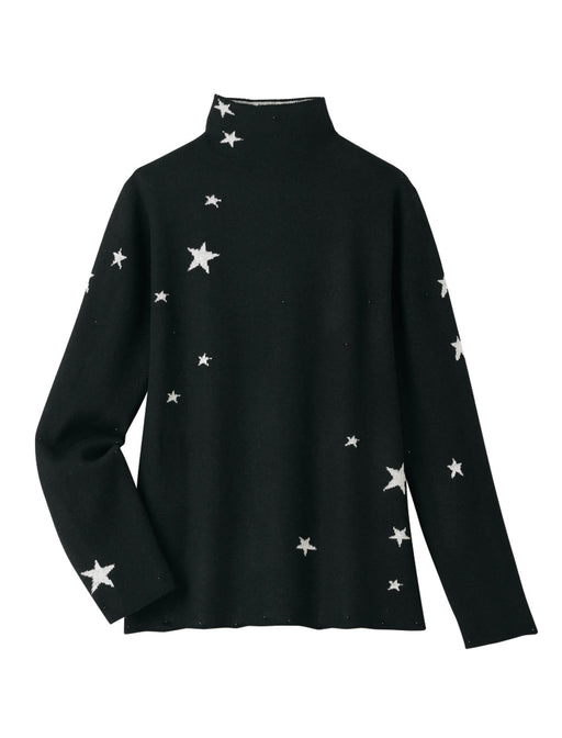 「前後&表裏」4通りの星柄ニット。 表裏で配色が反転するリバーシブル仕様に、前後でもニュアンスの異なる柄で着用できる4wayデザイン。 なめらかな編み立てが心地よいプルオーバーです。