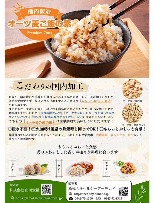 お米と一緒に炊いて美味しく食べれるよう厚めのオートミールに加工しました。 程よい厚めに加工することにより「もちっぷちっと食感」が楽しめます。 普段食べているお米に追加することにより、不足しがちな栄養素を補うことが可能です。