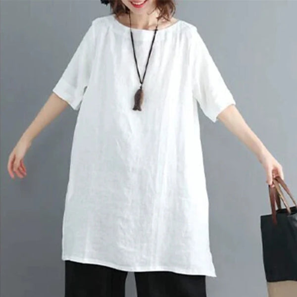 麻混のナチュラルさと日本製の色彩がコラボレーション。 身頃前後を肩で重ねたボートネックチュニック。 柔らかくて爽やかな麻混カットソーを使用し、ステンドグラスのような色柄やドレープ感が日本製ならではの美しさ。