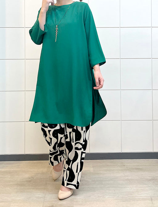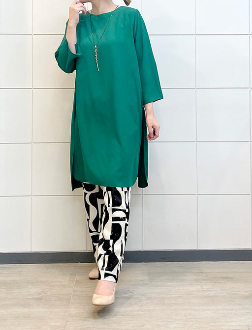 柔らかく落ち着きのあるボタニカル柄が、まるで水彩画のように優しく映えるチュニック丈ブラウス。 肌あたりも滑らかなので、さらっと軽やかに着こなせます。 デニムやワイドパンツと組み合わせて、旬な秋コーデの完成。