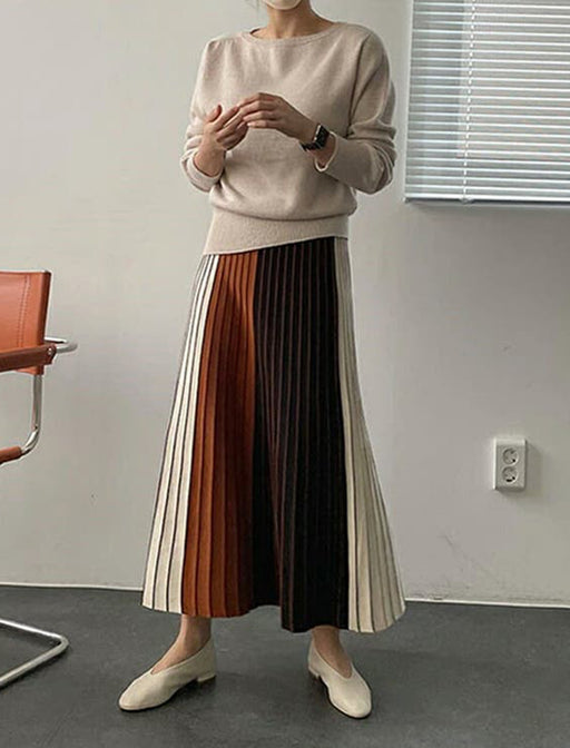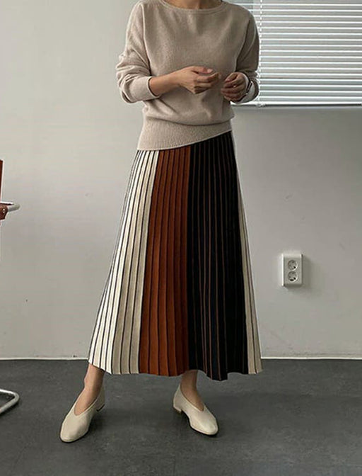 動くたびに揺れるプリーツが上品な雰囲気を演出。 配色デザインで表情豊かに見せ、シンプルなトップスと合わせても存在感のあるスタイルに。 シーズンレスで活躍するプリーツスカートです。