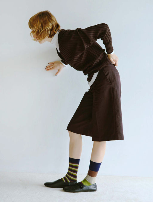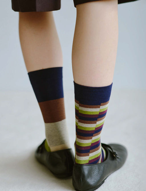 洗練されたボーダーデザインと細部までこだわった日本製の履き心地が魅力の一足。 左右で異なるアシンメトリーなデザインがさりげない個性を際立たせ、シンプルなコーディネートのポイントに。 ハーフパンツやスカートにも、ローファー・スニーカーとの相性抜群◎
