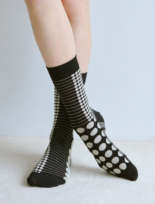 大胆なドットの配置と繊細なストライプで足元を主役に。 モノトーン配色が装いに品格と洗練を添え、モダンな個性を静かに主張します。 カジュアルなパンツスタイルにはもちろん、ドレッシーなワンピースに合わせても、足元からアートを感じさせてくれます。