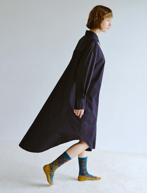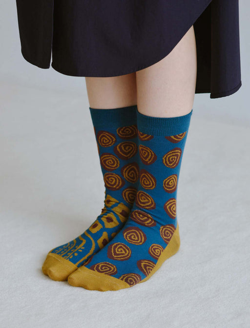 左右で異なるデザインが、足元から豊かな感性を表現してくれます。 深みのあるブルーにブラウンの渦巻き模様が全体に広がり、レトロな雰囲気を演出。 ワンピースやアースカラーを取り入れた装いにも、美しく溶け込んでくれます。
