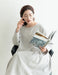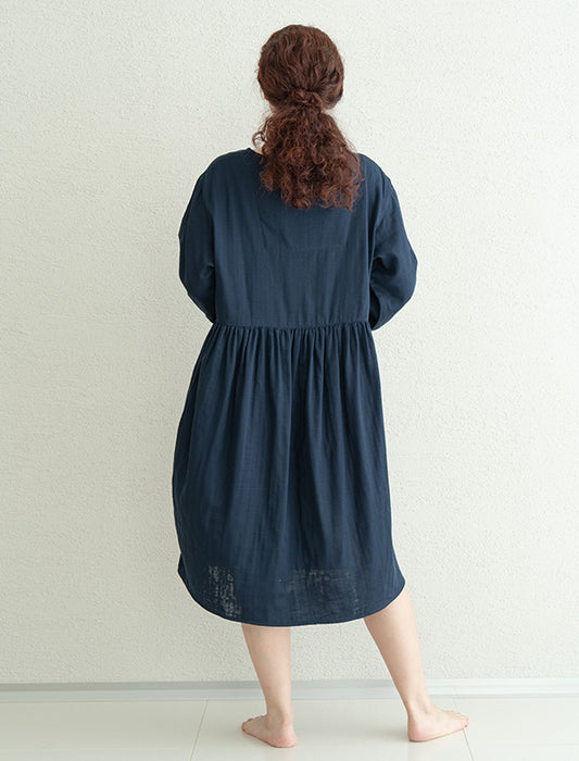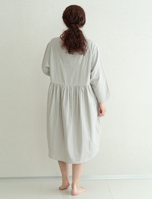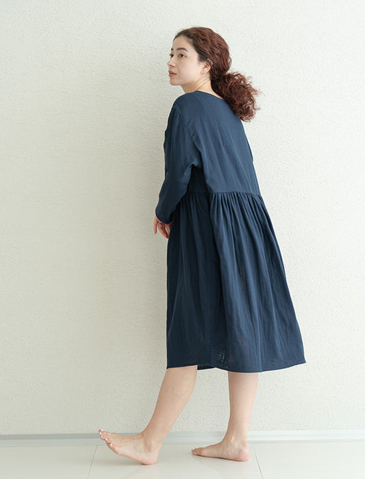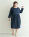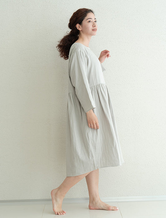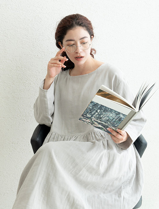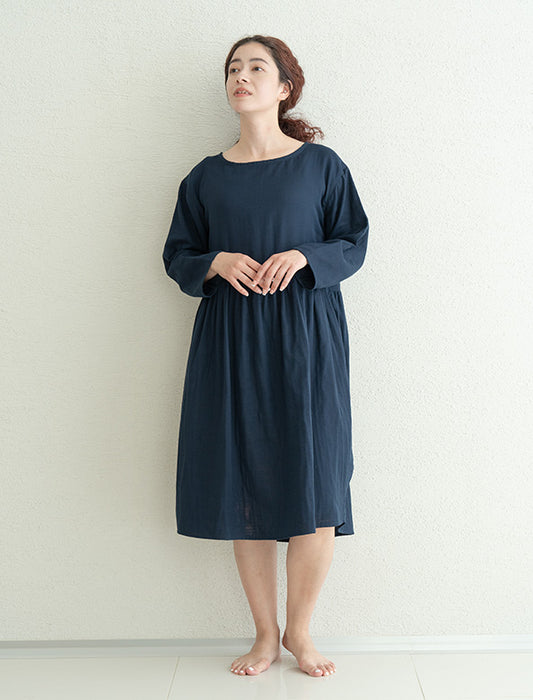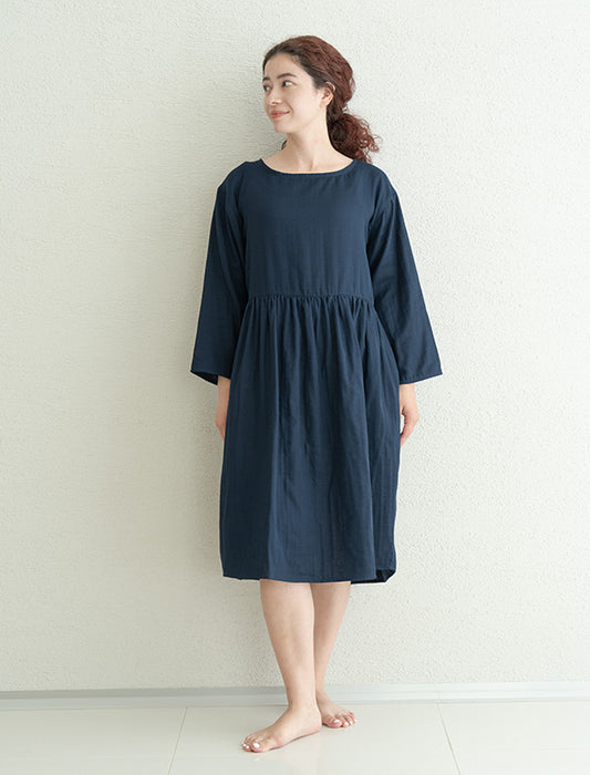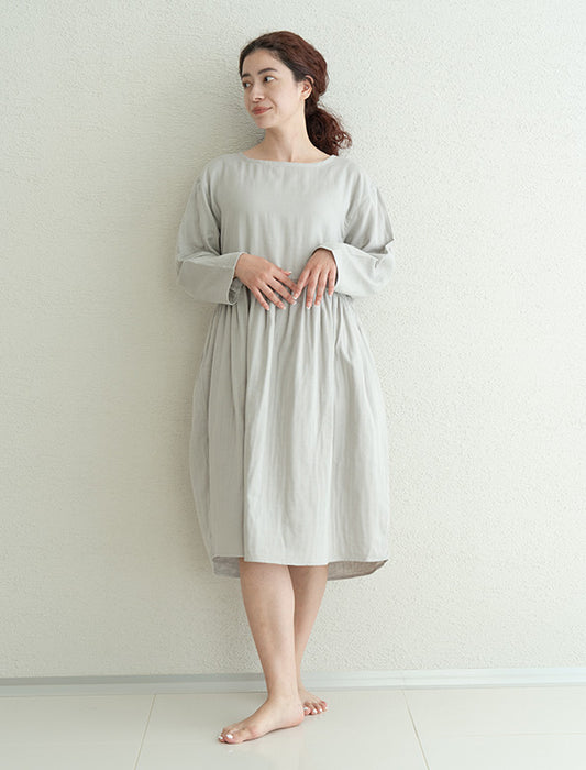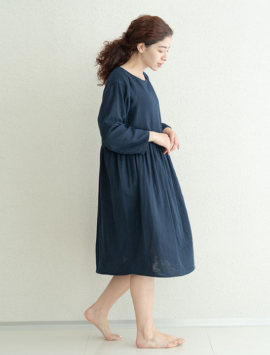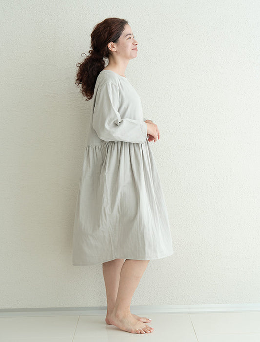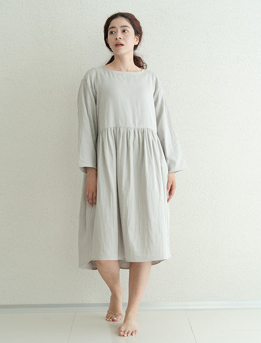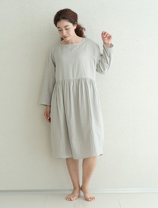 長袖ウエストギャザー切替ワンピースは、ゆったりとしたシルエットでリラックス感たっぷり。