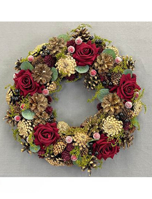 時を超えて咲き続ける華やぎ、ローズとグリーンが織りなす大人のクリスマスリース。ベルベットような美しいローズを贅沢に配した、エレガントなデザインです。ご自宅の玄関やリビングを、温かく、そして華やかに飾る、とっておきのウィンターデコレーション。