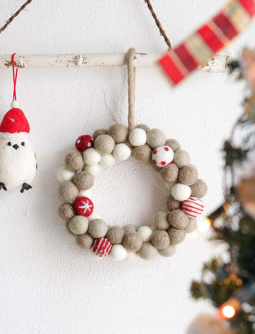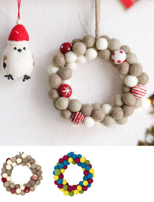 ひとつひとつ手作りのフェルトアイテムで飾る、温もりのクリスマス♪ ふんわりとした質感とカラフルな色合いが、冬のお部屋に温かな演出をしてくれます。br> コロンと丸いフェルトのポンポンを密に編み上げたリースは、見ているだけで心が和む愛らしいデザインが魅力。