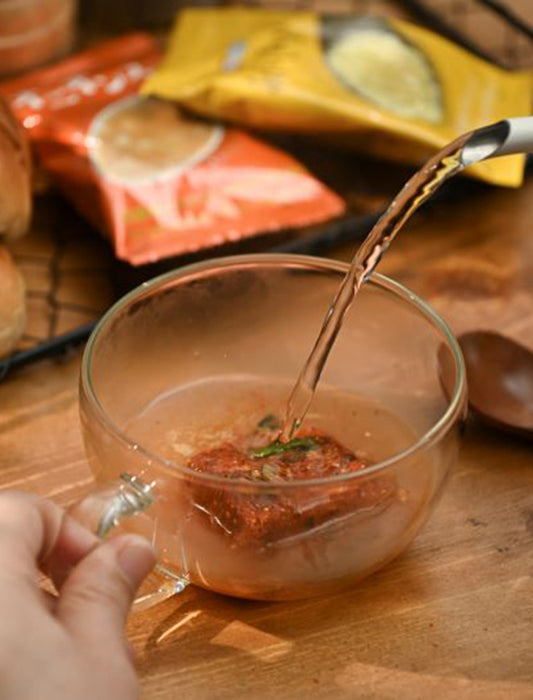 生姜が香る「生姜スープ」、野菜たっぷりの「ミネストローネ」、上品な風味が広がる「和だし玉子スープ」、さっぱりといただける「わかめスープ」、そしてコクのある「オニオンスープ」の5種類を詰め合わせました。