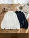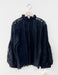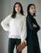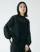クラシックなハイネックとボリューム袖が、洗練された女性らしさを引き立てます。