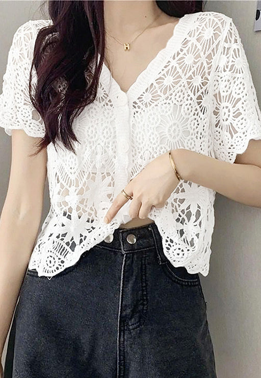 丸みを帯びた袖に施された繊細なレース模様が特徴。<br>肌が上品に透けて、涼しげで華やかな印象を与えます。<br>軽やかなコットン生地が風を通し、爽やかな着心地を提供します。