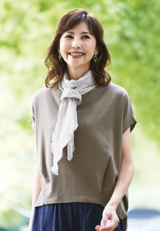 麻混のナチュラルさと日本製の色彩がコラボレーション。 身頃前後を肩で重ねたボートネックチュニック。 柔らかくて爽やかな麻混カットソーを使用し、ステンドグラスのような色柄やドレープ感が日本製ならではの美しさ。