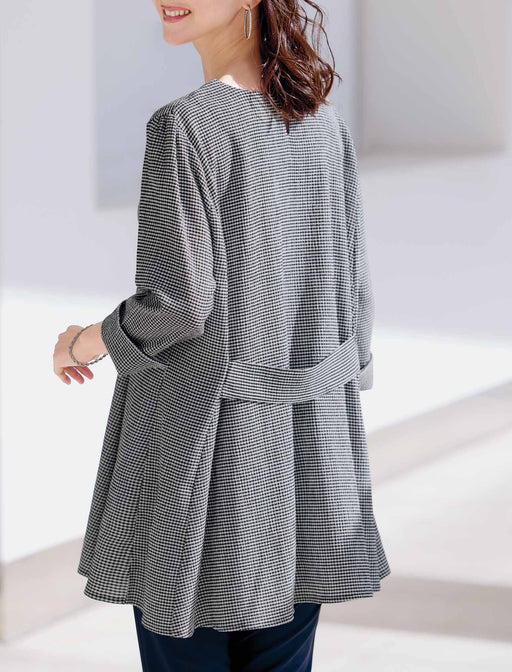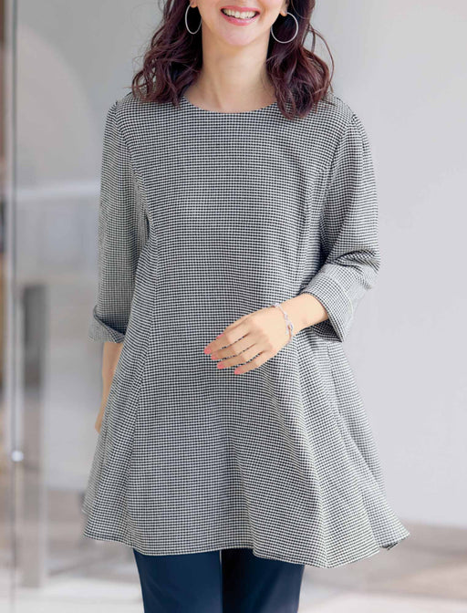 気持ちよく伸びて、軽やかな着心地のフレアチュニック。 シボ感のあるギンガムチェック生地は伸縮性があり快適な着心地。 パネル切替えのフレアシルエットが弾むように軽やかで、袖口スリットや後ろのベルト使いもおしゃれ見えポイントです。