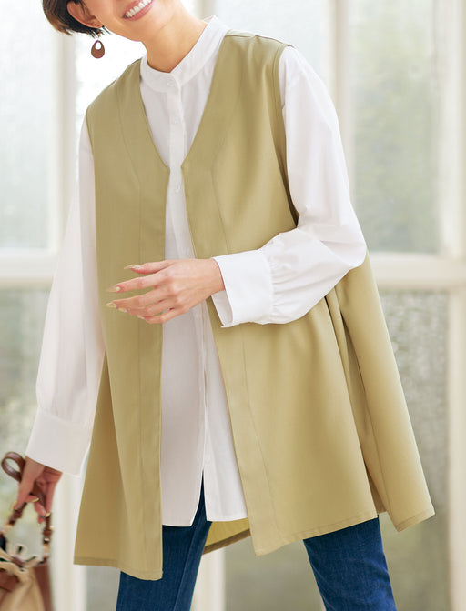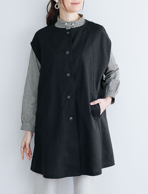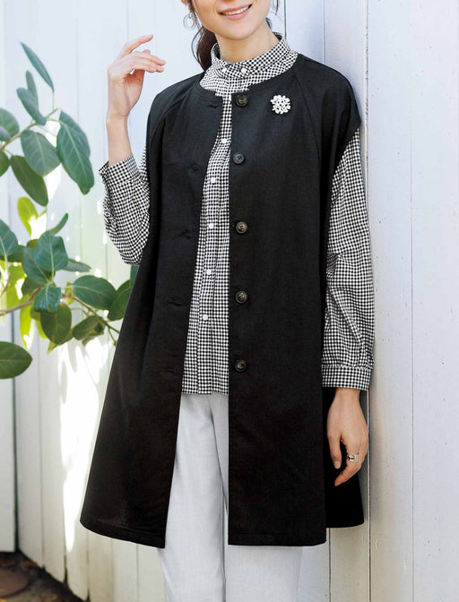 着こなしを凛と引き締める、ゆったりシックな洗練ベスト。 いつものスタイルに羽織るだけで洗練度が上昇。 ゆったり着られてスマート見えするベストは、羽織っても前を留めても絵になる一枚。 黒 × ロング丈で体型カバーもこなします。