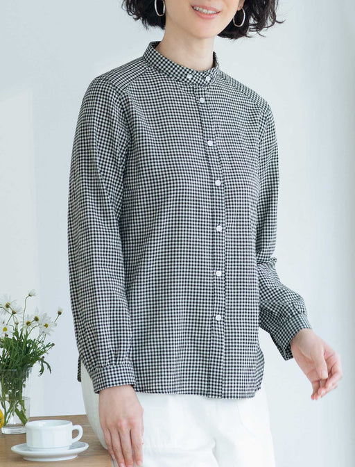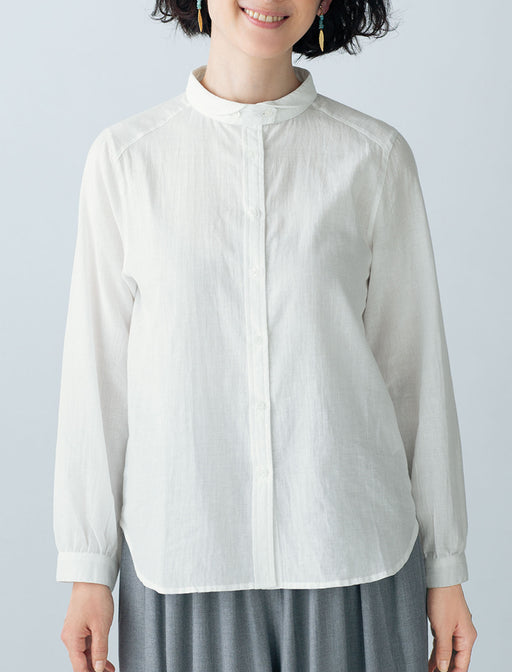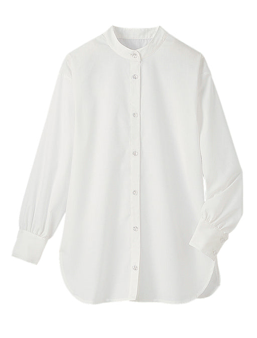 小さな丸襟が大人のかわいげ。きちんときれいな端正なシルエット。 一見シンプルに見えて、襟元にアクセントを効かせた洗練シャツ。 2 つボタンで留めたスタンドカラーを小さな丸襟で飾ったデザインに、ほのかなトラッド感と甘さが香ります。