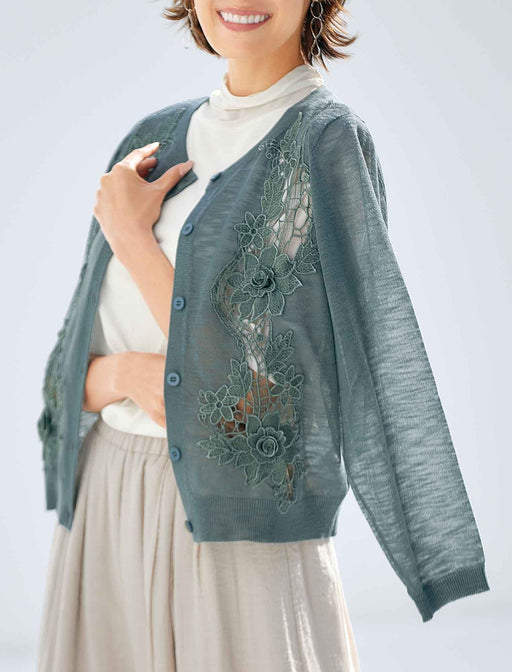 花モチーフ付の透かしレースカーディガン。 フロントに透かし柄の刺しゅうレースをあしらい、立体的なフラワーモチーフを咲かせたスモークグリーンのカーディガン。 ニット自体も薄い編み立てだから、軽やかに羽織れて涼しさも華やかさも満点◎