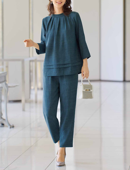 ブルーグリーンが瑞々しい、知的な印象のセットアップ。 自然なシワと落ち感のある合繊生地を使用。 ブラウスは品良く広がるフレアシルエットで、ネック下と裾のタック使いがアクセント。 セットのテーパードパンツで、スマートな佇まいを演出します。