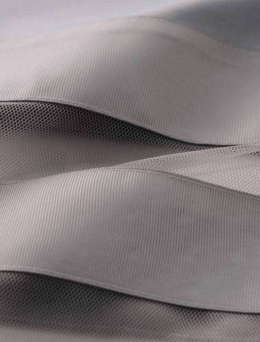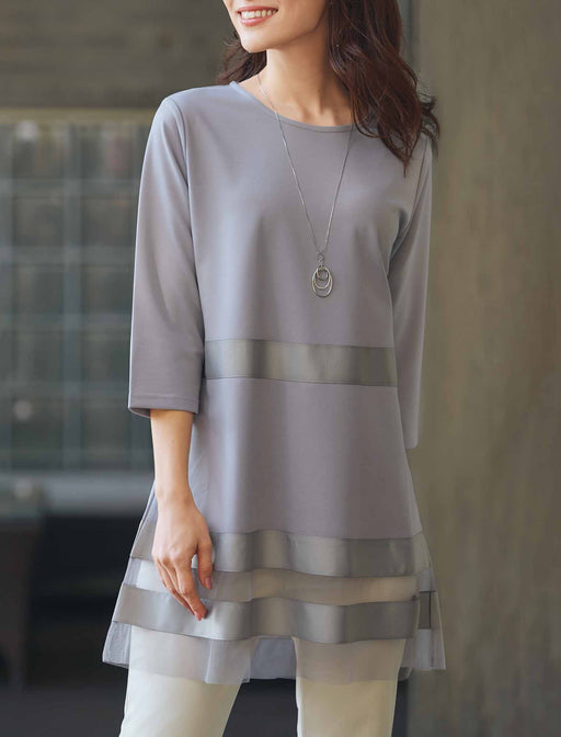 艶めきと透け感をミックスした異素材ボーダー。 身頃のベースは動きやすいストレッチカットソーを使用。 ボーダー状に切り替えたグログランテープやメッシュなど、異なる質感が着こなしを新鮮に見せてくれます。