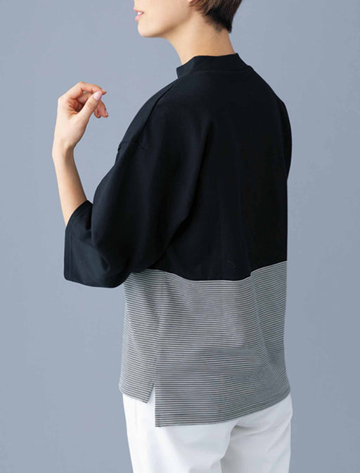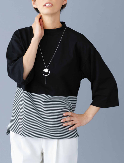 上品ボーダーで切り替えた、鮮度高めの黒トップス。 マンネリがちな黒トップスを、細めの ボーダーで大胆に切り替えて新鮮に。 ゆったり着られてハンサムに着映えるデザインは、袖の抜け感も軽やかな印象のポイントです。