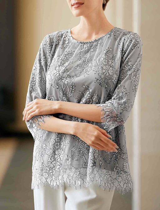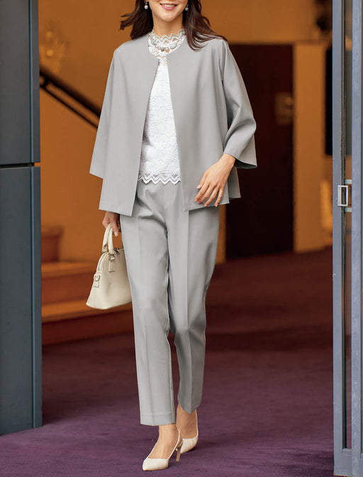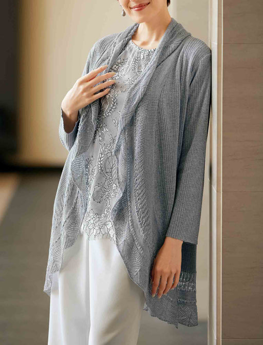 ラメ糸を編み込んだニットカーディガンは、エレガントな雰囲気で体型をカバー。 波打つようなトッパーラインで、襟から裾まわりにかけて繊細な透かし編みを施しています。 総レースブラウスは裏地付きで、袖口と裾はスカラップ仕上げと細部までこだわった一枚です。
