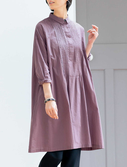 広がるAラインを、モードな彩りと端正なディテールで上品に。 裾へ向かってたっぷり広がるAラインのワンピースを、ほんのりモードなニュアンスカラーで大人っぽく。 長めに入れたピンタックと襟付きデザインで上品に仕上げました。
