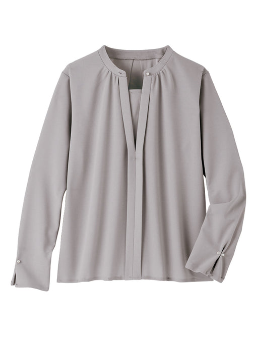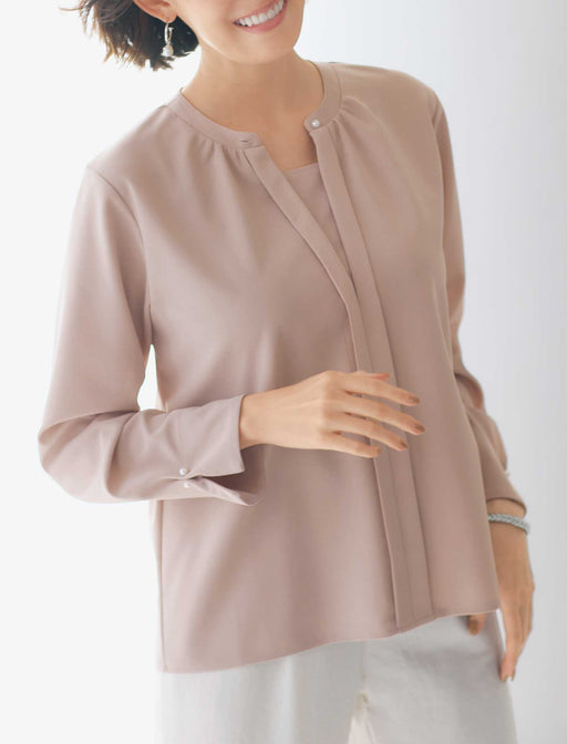 Tシャツの動きやすさとブラウスの上品さをいいとこ取り「Tブラウス」 繊細な表面感のカットソージョーゼットを使い、胸元のデザインを重ね着風に仕立てています。 パール調ボタンをタック袖にも施し、手元の仕草も品良く美しく。
