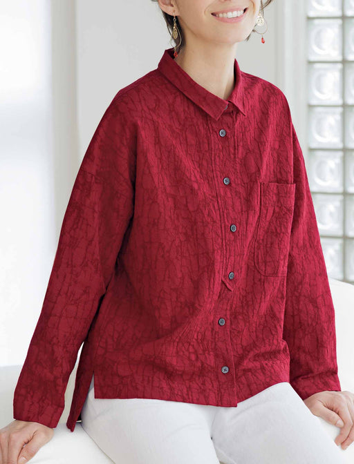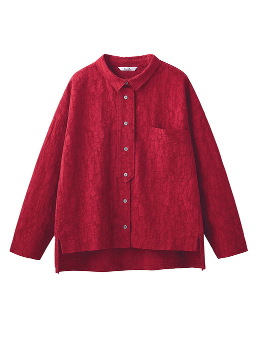 顔色まで美しく映す、ジャカード織と深い赤。 表情を明るく見せてくれる美しい色と、立体的に浮き立つジャカードの織り柄がエレガント。 タブを効かせた前立てもおしゃれなシャツは、 合わせるボトムスを選ばず、装いに華やぎをまとわせます。