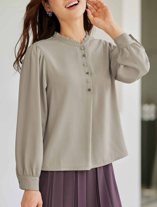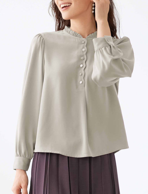 フリルや配色ボタンがさり気なく可憐。 小さなフリル襟や前端のスカラップ仕立てが可愛らしいブラウス。 ボタンは一つ置きに飾りボタンを配置して、手間なく着られるよう配慮しています。