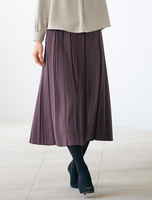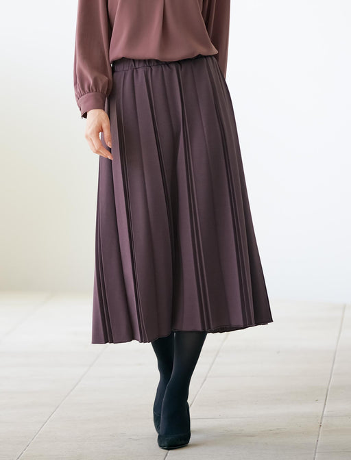 落ち感が美しいジャージ素材で、すらっと端正な佇まい。イレギュラーピッチのプリーツスカートは、端正な縦ラインとほんのりとした艶感が気品を醸し出します。じつはジャージー素材だから伸びやかで動きやすく、ウエスト総ゴム仕様で脱ぎはきもラクラク。
