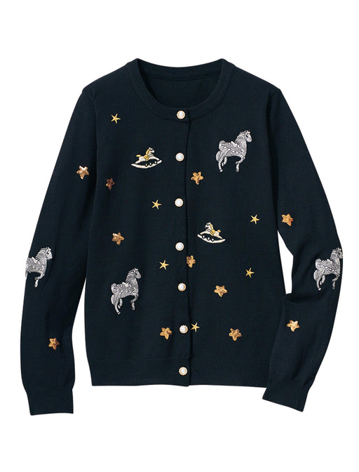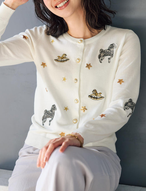 今季のトレンド「デコラティブ」を、デイリーに落とし込んだ自信作。大胆に配置された立体的な木馬や星の装飾が、スタイリングに奥行きを与えます。パール調ボタンもきらめいて洗練された雰囲気を醸し出します。