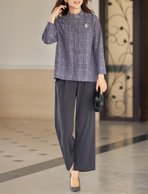 織柄の表情が奏でる優雅な佇まい。 表情豊かな立体的な変わり織ブラウスは華やかな雰囲気。 セットのセミワイドパンツは落ち感がきれいで着こなしをスマートに印象づけてくれます。