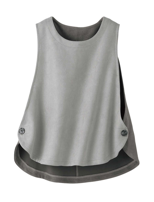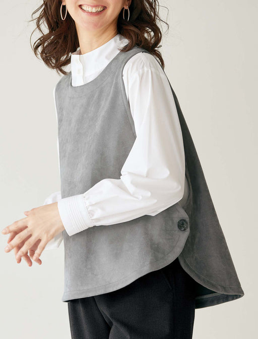 前後の配色が可愛い、スエードタッチベスト。 やわらかな風合いのカットソーを使い、両脇の飾りボタンがポイントのゆったりフレアなシルエット。 シンプルなボトムスと合わせるだけで、凝ったスタイリングに見える「時短オシャレ」の強い味方です。
