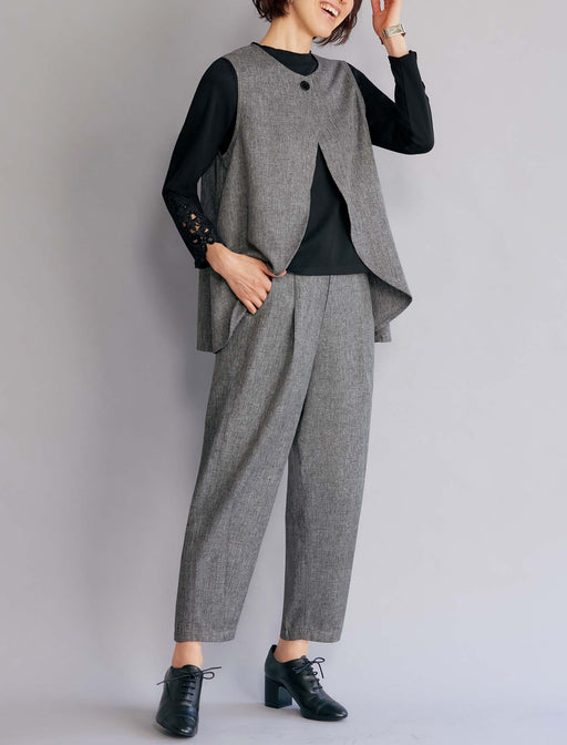 杢調の合繊生地で仕立てたベストとパンツのセットアップ。ベストは弧を描きながら後ろへ広がる裾が、ヒップ下までゆったりカバーしてくれます。パンツもゆとりあるはき心地で、それぞれ単品でも着回しに活躍します。