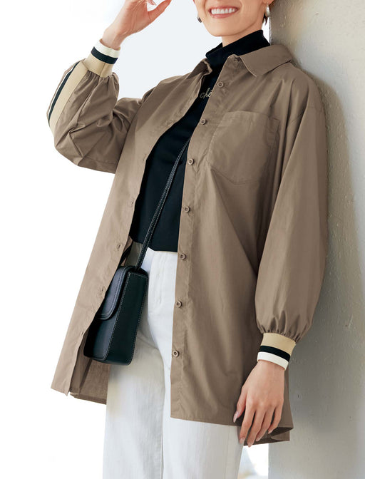 カラーラインがお洒落な大人シャツチュニック。 後ろ身頃から袖口まで続くストレッチリブカットソーのカラーラインテープ使いがアクティブな印象。 適度なハリ感の生地は軽い羽織りとしてもスタイリッシュに着こなせます。