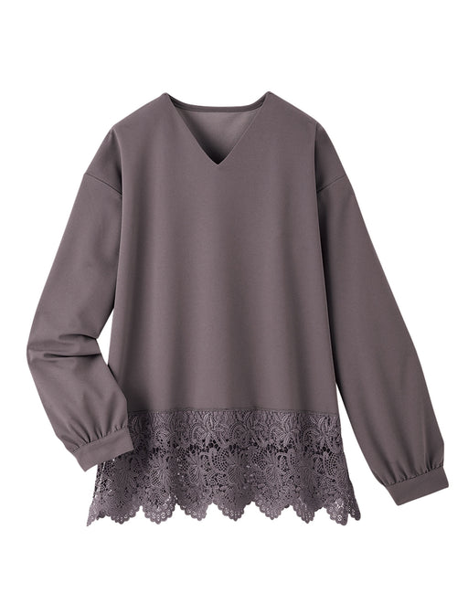 やわらかな質感とレースで洗練されたセットアップ。 ジョーゼットのような風合いにブラウス裾のレースがひときわ華やか。 ジャージー素材で動きやすく、単品での着回しにも重宝します。