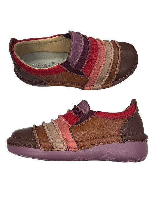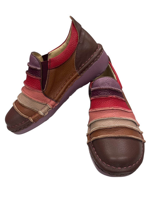 多色のレザーを重ねたボーダーデザインが、暗くなりがちな足元を華やかに。 クッション性に優れたソールで長時間のお出かけも快適です。 履くだけで気分が上がる、大人の遊び心と機能性を兼ね備えた一足。