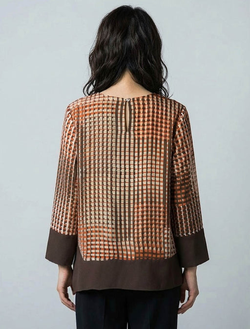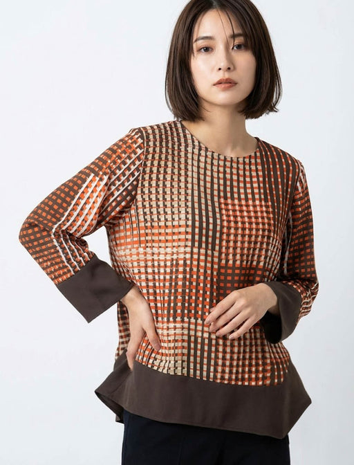 幾何学的なチェック柄と裾のバイカラーが目を引く一着。 アシンメトリーな裾のデザインが、体型をカバーしつつ洗練された印象を与えます。 一枚でサマになる、大人のためのモードなきれいめトップスです。