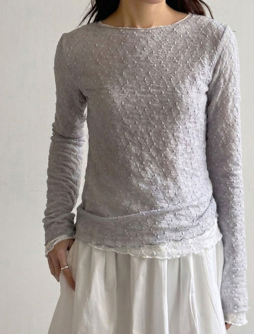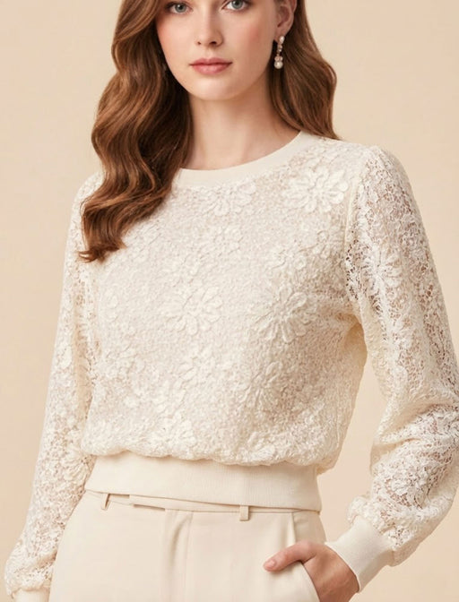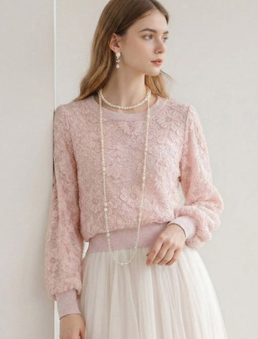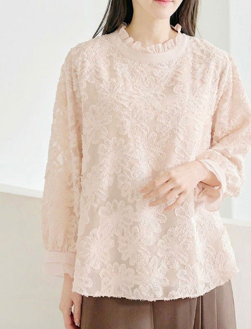 浮き上がるような立体的なレースが贅沢な一着。 首元と袖口のメロウフリルが優しげなニュアンスを添え、1枚で華やかな印象に。 透けすぎない絶妙な素材感で、オンオフ問わず上品な装いを叶えます。