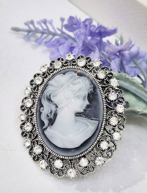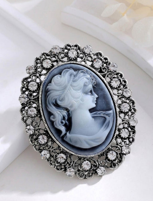 繊細なカメオの横顔を囲むようにビジューを贅沢に配した、気品漂うデザイン。 クラシックな雰囲気が胸元に洗練された知性を添えます。 フォーマルな場から日常の装いの格上げまで幅広く活躍する逸品です。