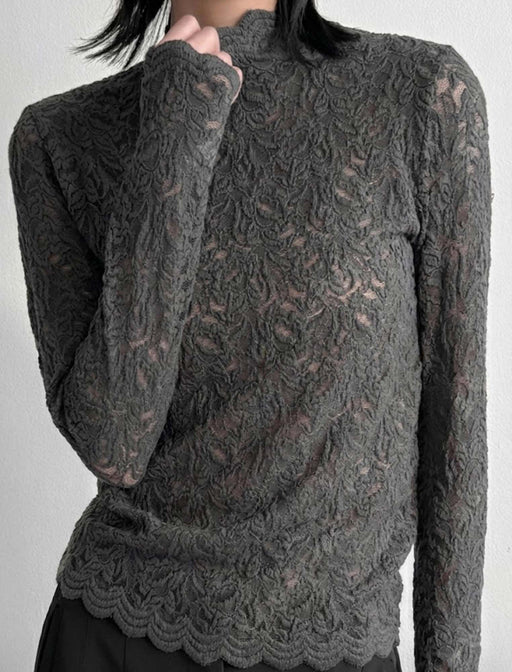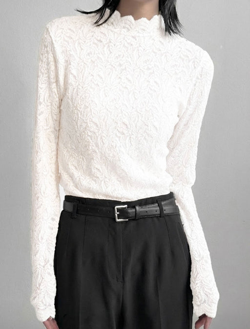 繊細なボタニカル柄レースが素肌を美しく透かす、上品なハイネックトップス。 首元と裾の波打つメロウ仕上げが、女性らしい柔らかなニュアンスを添えます 1枚でも、ジャケットのインナーとしても映える万能な一着です。