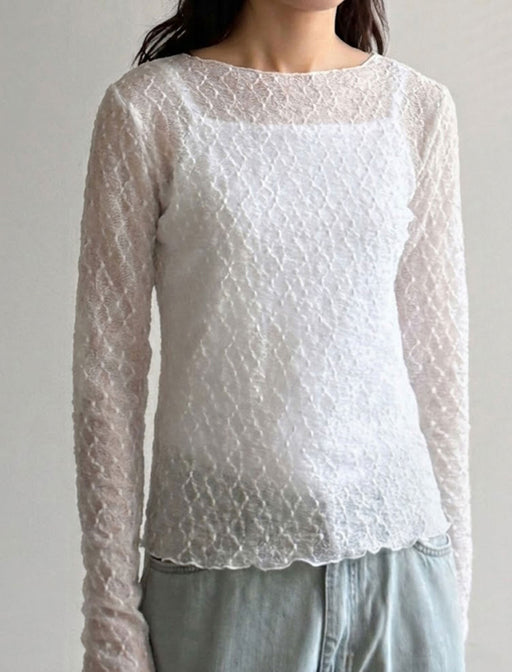 繊細な幾何学模様のレースが、都会的で洗練された印象を与える一着。 ボートネックの襟元がデコルテを美しく見せ、程よい透け感がヘルシーな色気を演出します。 1枚でもレイヤードでも映える、着回し力抜群のトップスです。