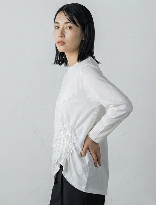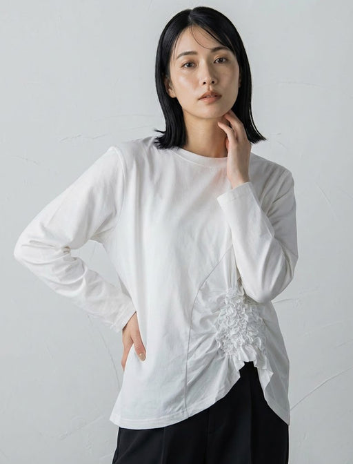 サイドの立体的なシャーリングが目を引く主役級カットソー。 アシンメトリーな裾と異素材使いが、ゆったりシルエットに都会的なメリハリを添えます。 一枚でモードに決まる、大人の体型カバーを叶える一着です。