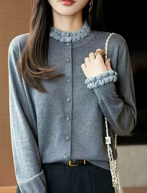 襟元と袖口の立体的なフリルが、クラシカルでフェミニンなアクセント。 柔らかな肌触りと上品な配色デザインが、日常の装いを格上げします。 1枚着としても羽織りとしても活躍する、大人可愛い優秀ニットです。