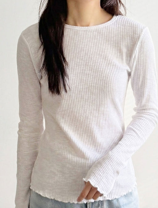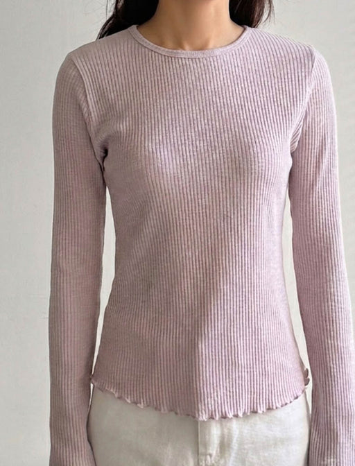 程よい透け感と細リブが華奢見えを叶える一枚。裾のメロウ加工が大人可愛く、インナーとしても1枚着としても重宝します。肌馴染みの良い4色のニュアンスカラーで、毎日のコーデに彩りを。