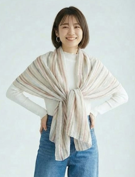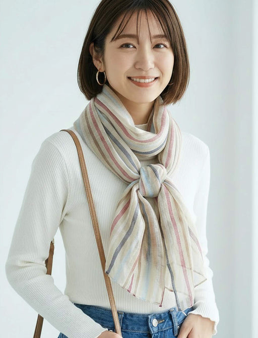 光沢感のあるシアー素材に、繊細なマルチストライプが映える上品なストール。 軽やかな巻き心地で、首元にプラスするだけで顔周りをパッと華やかに演出します。 オンオフ問わず、季節の変わり目のアクセントに最適。